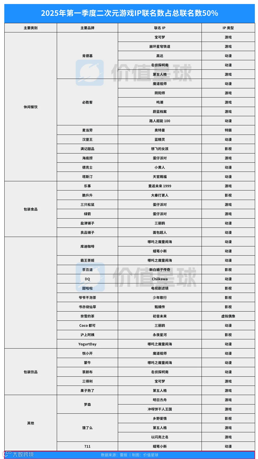 据价值星球统计,仅2025年第一季度,各品牌与二次元、游戏IP的联名数量就有近60个,平均每个月有15个。而影视联名的数量只有13个,不到二次元和游戏IP的四分之一。