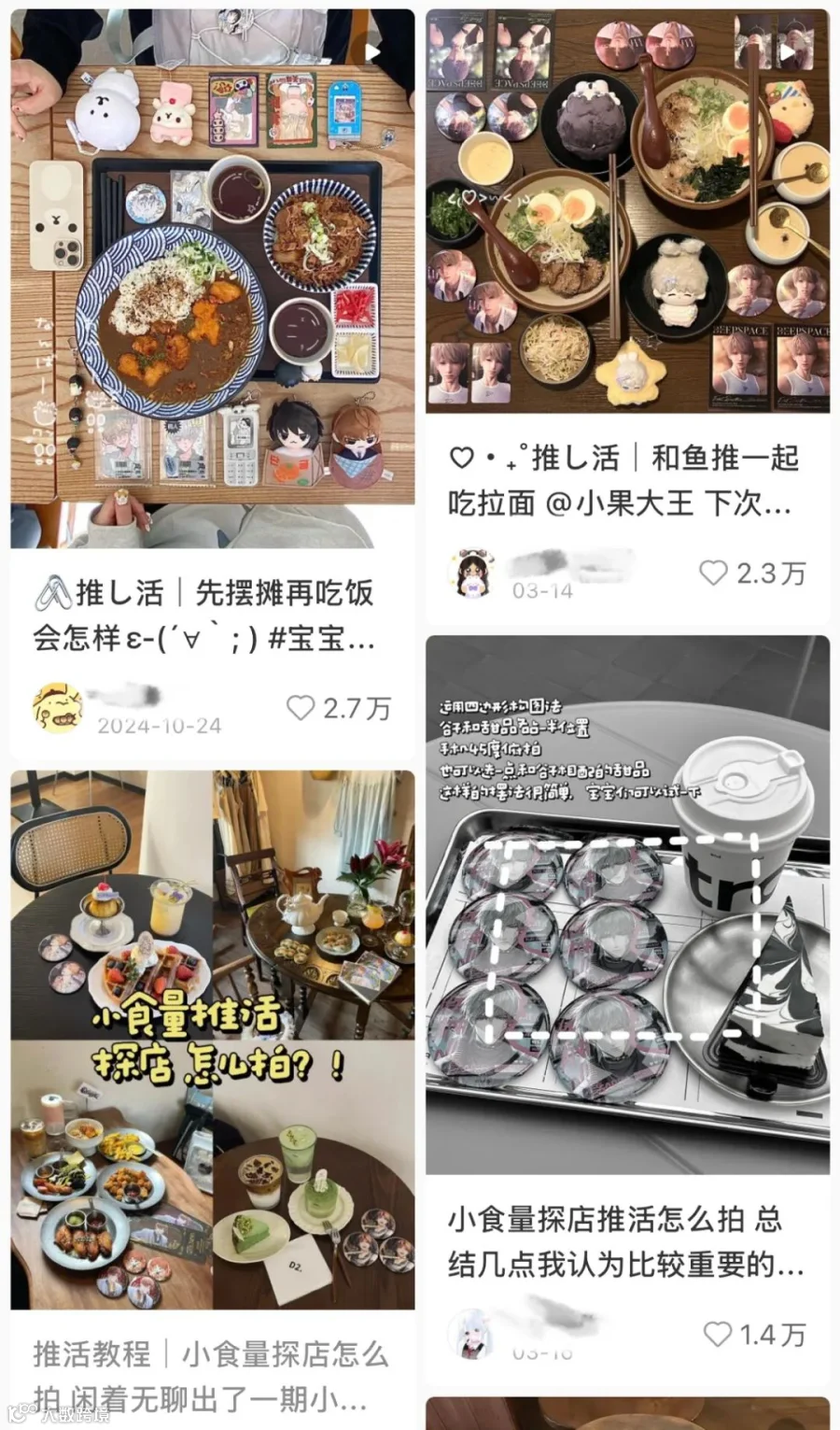 吃谷较少的消费者,最流行的方式是在咖啡厅、餐厅、飞机等线下场所拍照纪念。一个月前,沐沐就特意去线下咖啡厅给自推过了生日。“在平台上搜索推活探店,就能出来很多攻略。包括店铺攻略、互动姿势、谷子摆放参考和后期滤镜等等。”