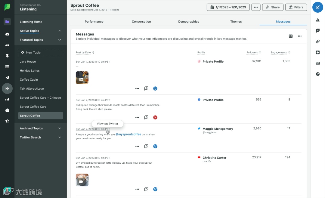 Sprout Social是一款专业社交媒体管理工具,可全面追踪品牌相关讨论,分析消费者对产品、广告活动的态度。支持KOL挖掘、客户体验洞察与自定义危机预警,助力品牌提前应对潜在风险。