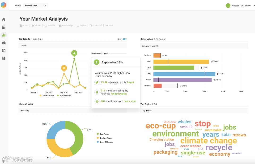 Brandwatch整合社交媒体聆听、发布、广告监测与客户数据管理功能,从海量数据中提取洞察。支持多语言情绪分析(正面/中性/负面),设置舆情预警与自动化报告,帮助品牌及时应对声誉风险,把握市场趋势。
