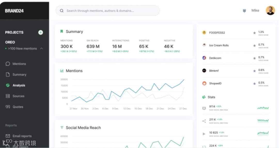 BrandMentions覆盖全网信息源,可监控品牌在各类平台的提及情况,提供全面情绪分析。支持竞品动态追踪、自定义邮件预警与链接通知,便于及时响应市场变化。