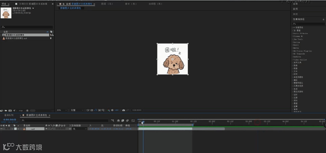 打开AE剪辑软件,导入刚刚用豆包生成的表情包,通过裁剪功能,裁剪出想要的片段进行渲染,输出设置为png序列格式。