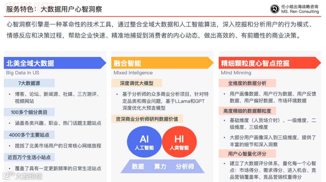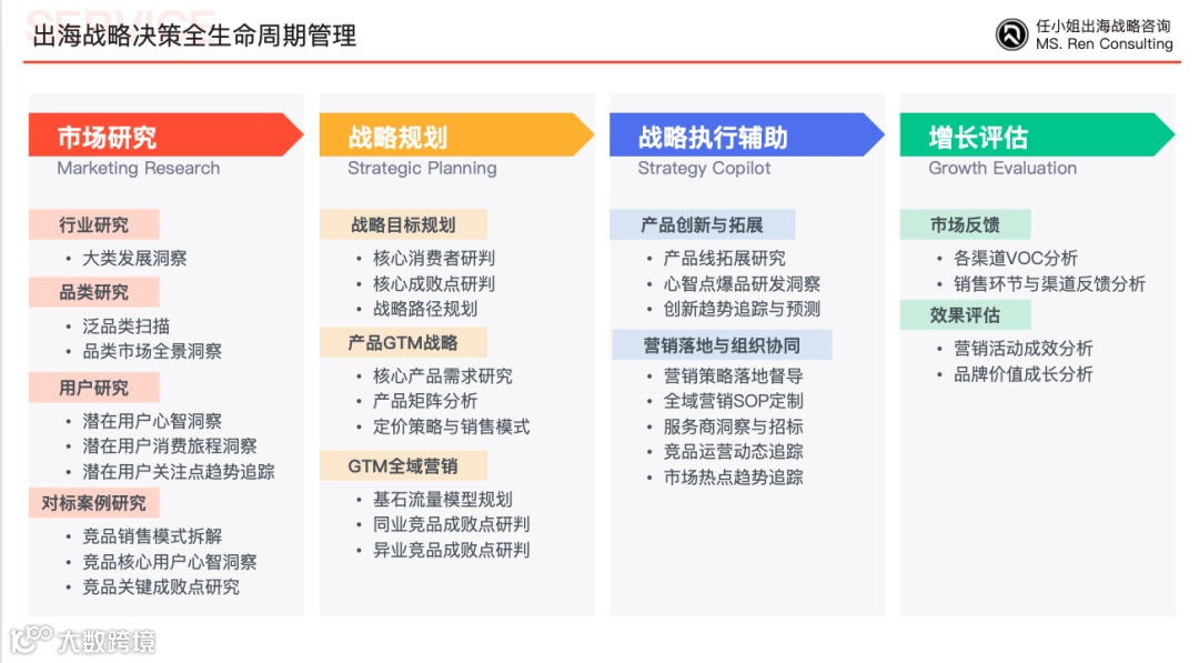 市场洞察还是品牌和产品定位心智的关键一环。在跨境企业普遍想要从卖货逻辑转型到品牌逻辑的今天,任小姐出海战略咨询公司基于心智洞察引擎,曾帮助跨境企业改变思路,将其薄利多销的卖货模式, 转型为兼具高客单价和高复购的品牌模式,使企业生意更健康长久。市场洞察的重要性已经不言而喻。