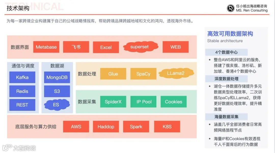 亿邦动力获悉,任小姐出海战略咨询公司自研了大数据心智洞察引擎,通过整合AWS和阿里云的服务,搭建俄亥俄、洛杉矶、新加坡、香港4个数据中心,以完善的数据中台、行业中台、策略中台为依托,为中国出海企业提供数据化战略决策依据。