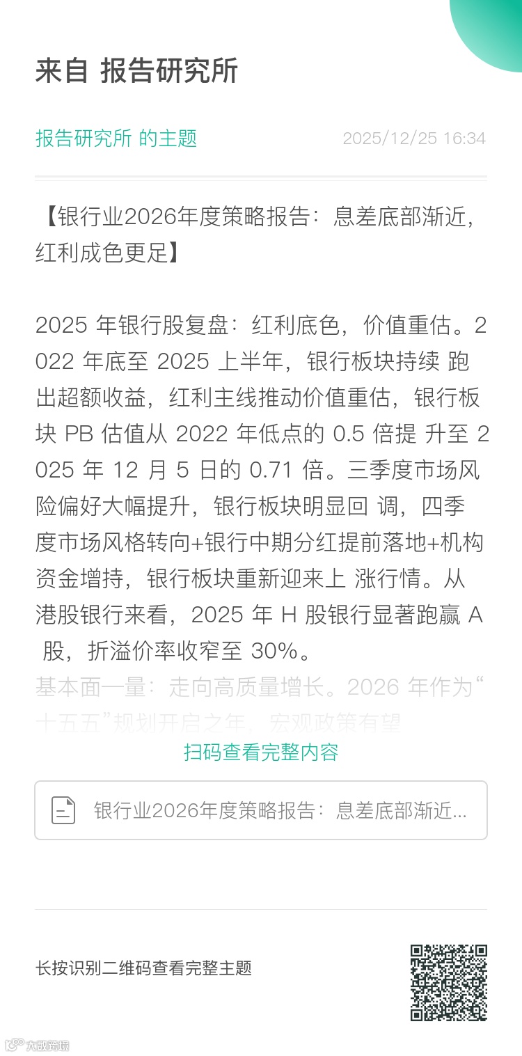 四季度险资增持动能不减:四大行中期分红时点已提前至2025年12月上旬(2024年为2025年1月),叠加年末保险开门红新增保费配置需求,存在提前抢配银行股动力。