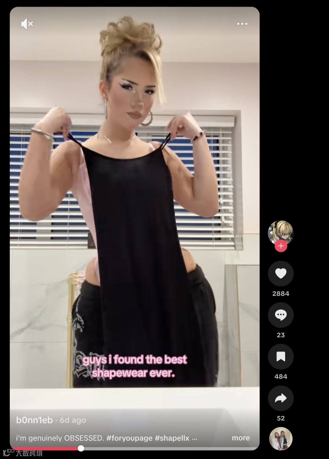 合作视频采用“前后对比”形式,仅用十几秒即直观呈现收腰塑形效果;场景设定为卧室或浴室,搭配口语化字幕(如“我找到了最棒的塑身衣”),营造闺蜜式真实分享氛围,精准击中用户“即刻变美”的核心诉求 [2] 。
