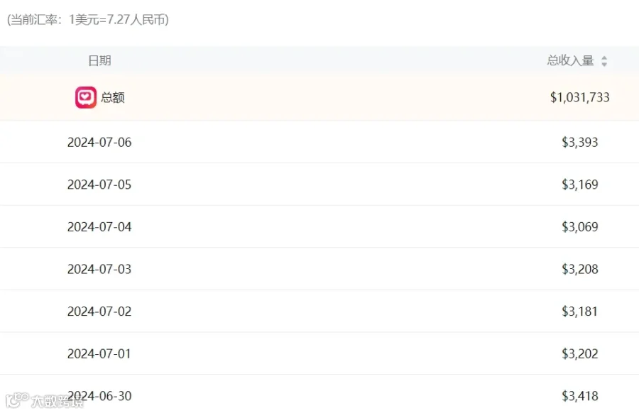 根据点点数据的统计,从2023年7月8日至2024年7月8日,MoboReels在韩国地区收入1031733美元,折合人民币超过750万元,7月日均收入也维持在3000+美元,折合人民币约20000+元。