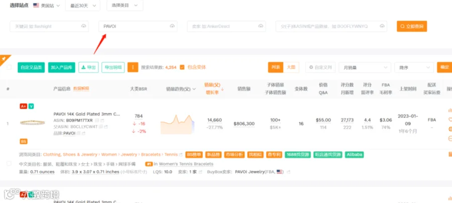 比如女士项链RAVOI在亚马逊搜索结果 近30天内 有4254 条,包含变体的情况下:
