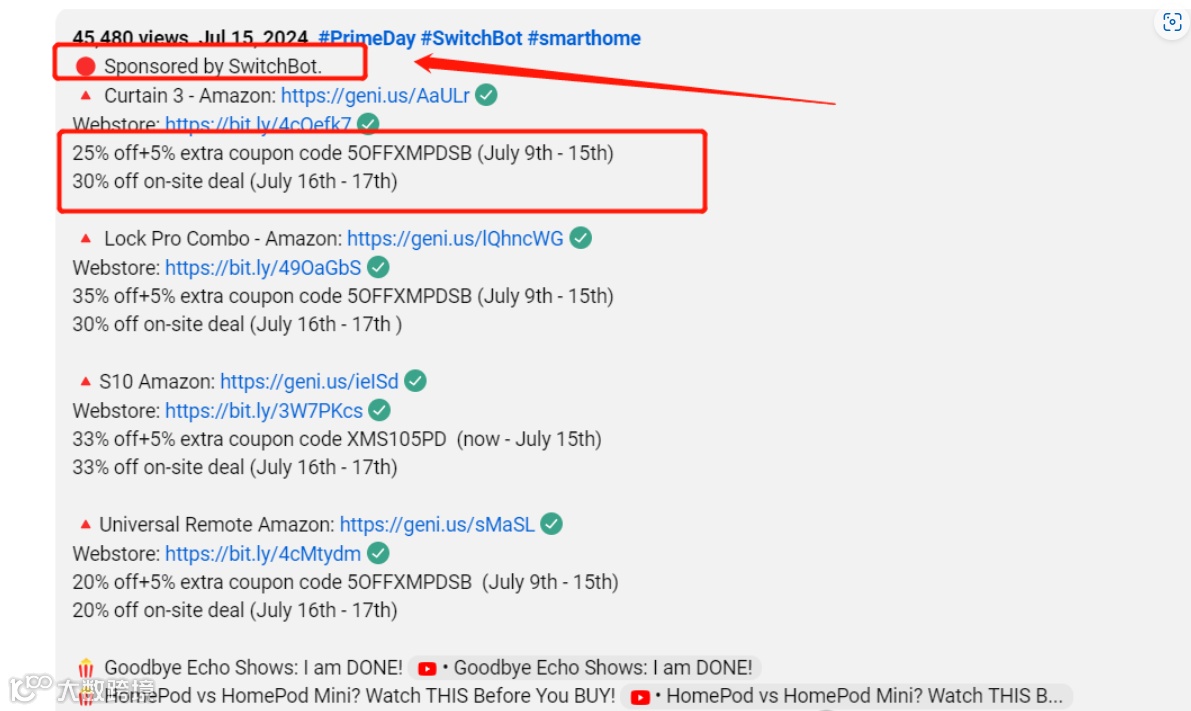 有品牌方sponsor(你可以看上面博主写了Sponsored by switchbot,一般这么写说明这个品牌有主动建联博主付费合作)
