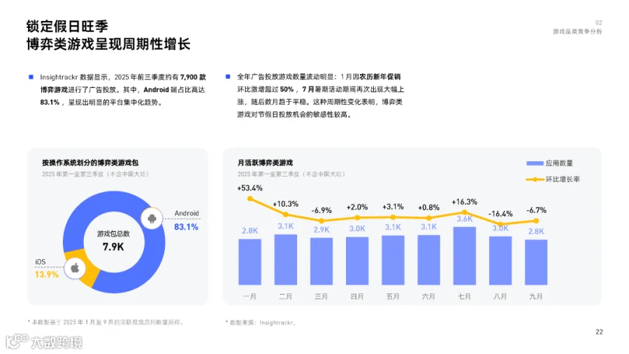 约7,900款博弈类游戏进行广告投放,Android平台占比高达83.1%,呈现显著平台集中化特征。
