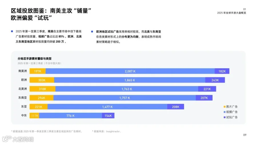 2025年Q1–Q3,南美成为主要市场中广告素材投放量最高的地区,视频广告占比近85%;欧洲试玩广告采用率相对更高;北美与东南亚各类素材分布更为均衡。