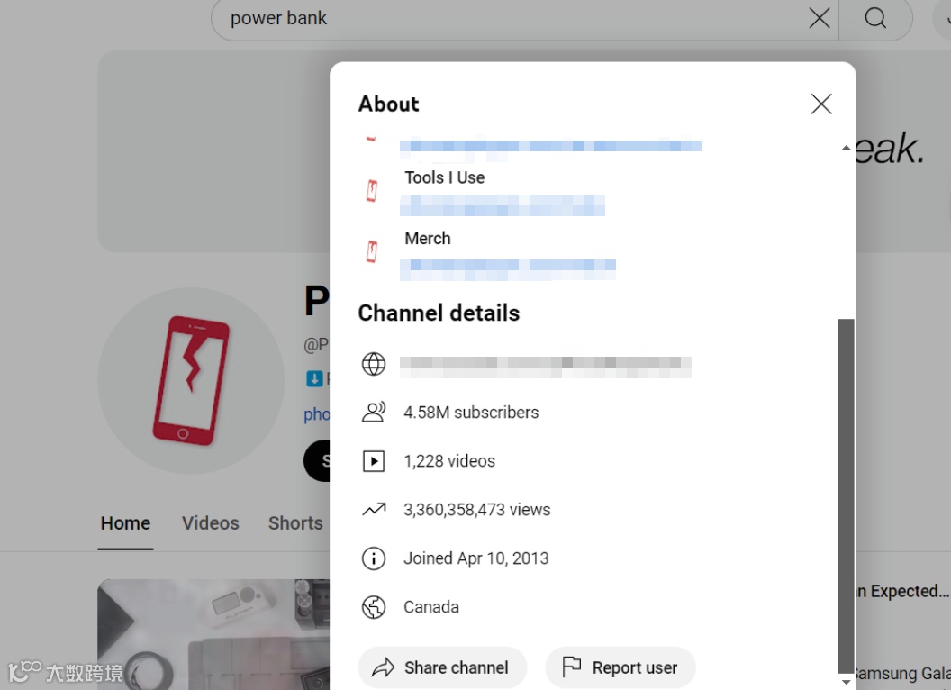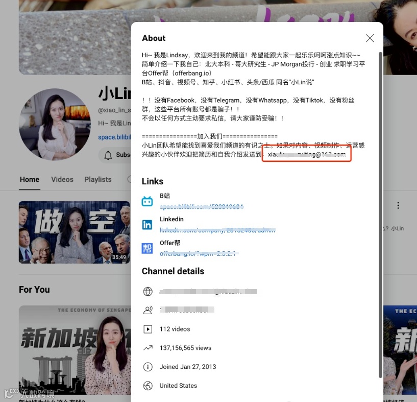 就是YouTube网红博主往常常见的邮箱板块不见了
