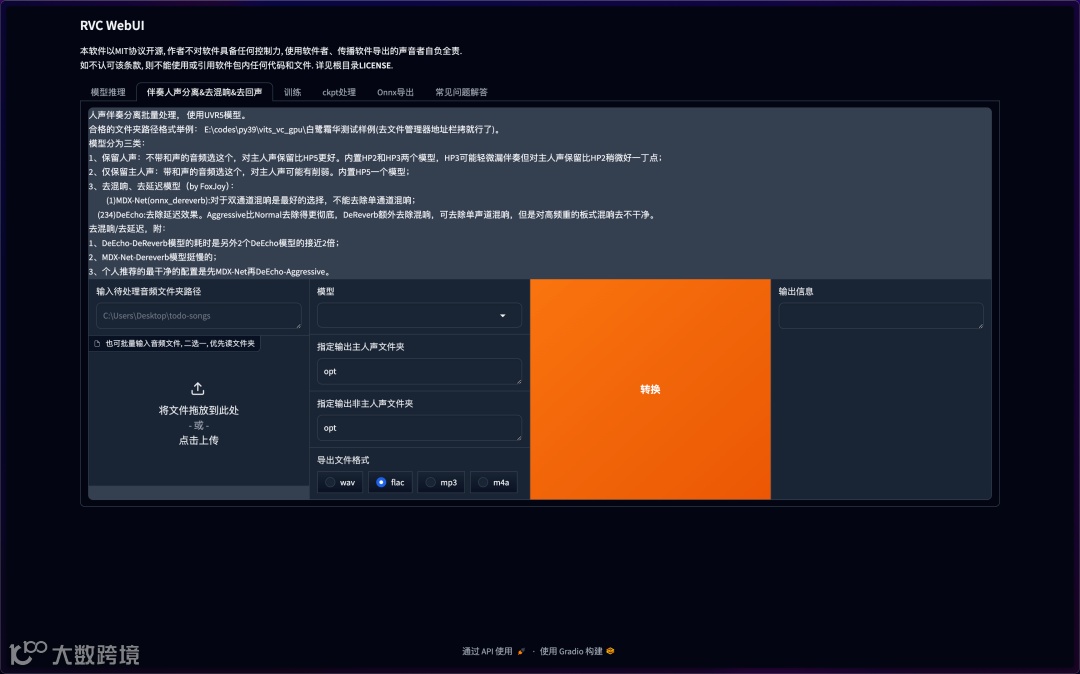 2、伴奏分离:UVR5 模型自动去伴奏,保留干净人声。