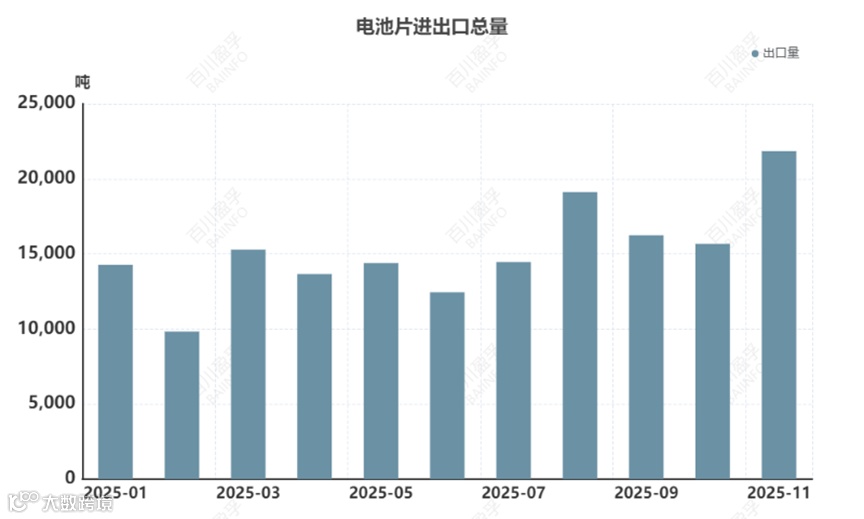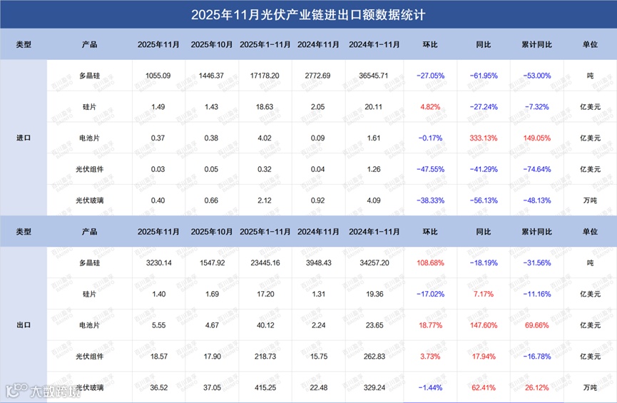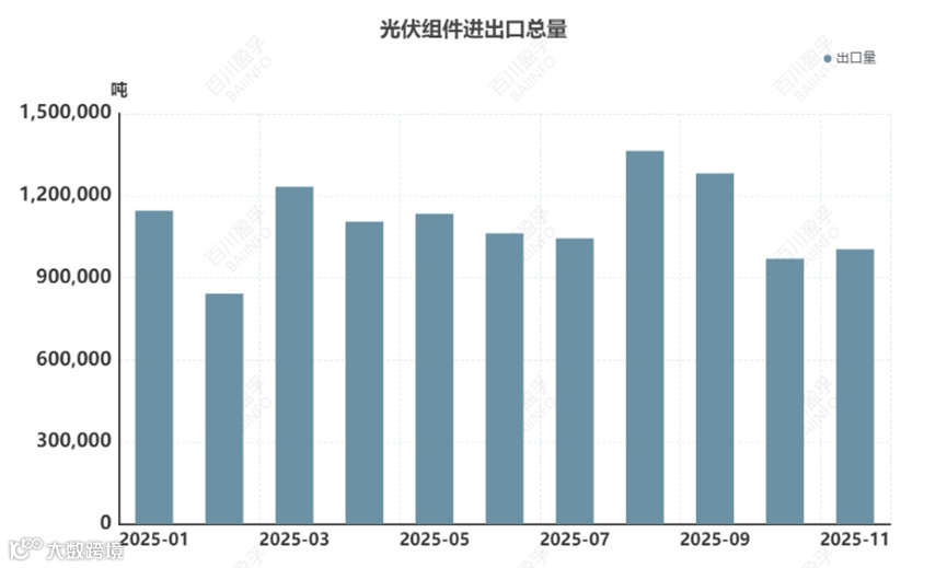 2025年11月中国电池片出口金额为5.55亿美元,同比增加147.6%,环比增加18.77%,2025年1-11月出口总额为40.12亿美元,累计同比增加69.66%。其中主要出口国家及地区为印尼、印度、坦桑尼亚及菲律宾等。