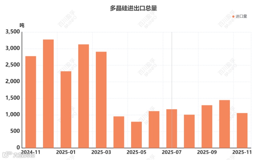 2025年11月中国多晶硅进口量为1055.09吨,同比减少61.95%,环比减少27.05%。2025年1-11月进口总量为17178.20吨,累计同比减少53.00%。2025年11月中国多晶硅主要进口国家及地区为德国、日本、马来西亚、美国等。