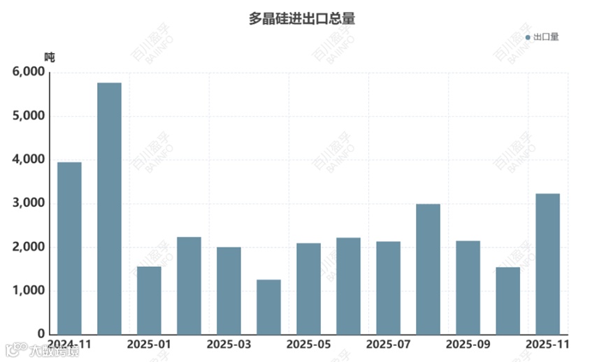 2025年11月中国多晶硅出口量为3230.14吨,同比减少18.19%,环比增加108.68%。2025年1-11月出口总量为23445.16吨,累计同比减少31.56%。其中主要出口国家及地区为越南、泰国、荷兰、韩国等。