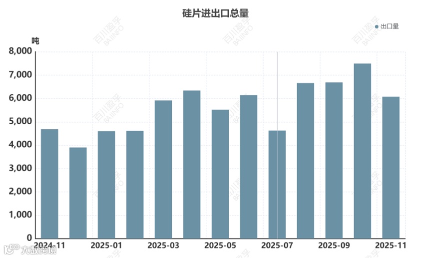 2025年11月,中国硅片出口金额为1.40亿美元,同比增加7.17%,环比减少17.02%;2025年1-11月出口总金额为17.20亿美元,同比减少11.16%。其中主要出口国家及地区为印度、越南、老挝、印尼及埃塞俄比亚等。