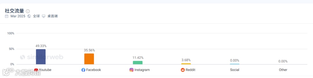 图源:similarweb此外,DYU打造社交媒体矩阵,在YouTube、TikTok、Facebook上开设官方账号,Youtube营销占比达49.3%,Facebook流量占比35.56%。