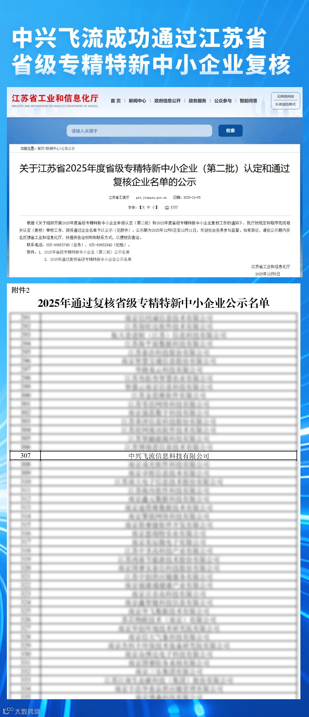 2025年12月5日,江苏省工业和信息化厅正式公布了省级专精特新中小企业复核名单,中兴飞流信息科技有限公司凭借不断增强的自主创新能力以及长期积累的核心竞争力,成功通过了2025省级专精特新中小企业认定复核,标志着中兴飞流在“专业化、精细化、特色化、新颖化”四大维度获得了社会的认可。