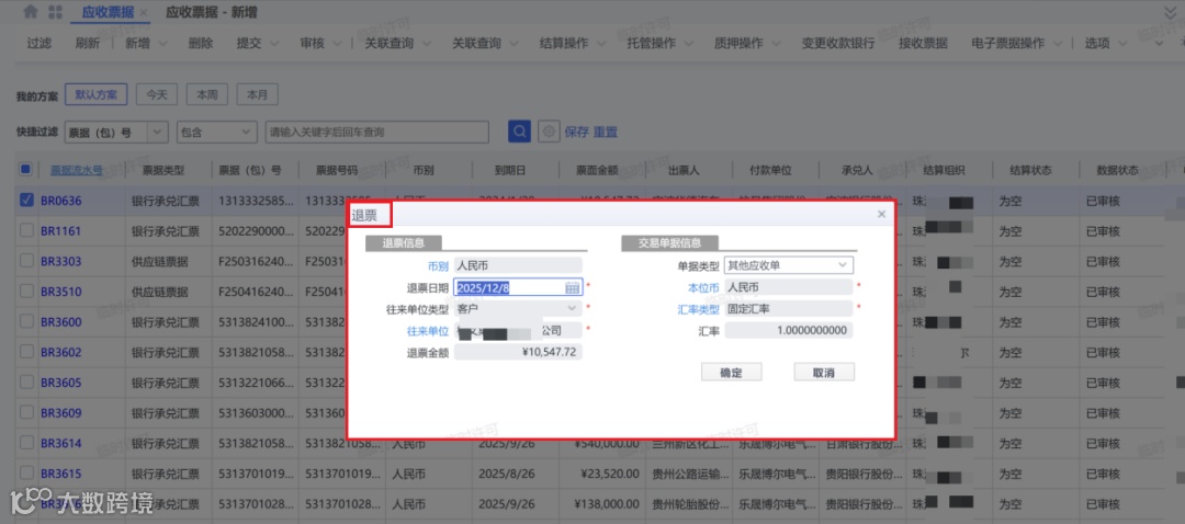 该操作需要票据被收款单完全引用且结算状态字段为“空”或者“背书退回”,点击结算操作——退票,系统弹出对话框,录入背书相关信息确认后点击确定,此时应收票据结算状态为“退票”并自动生成应收票据结算单;同时根据单据类型生成其他应收单或收款退款单。