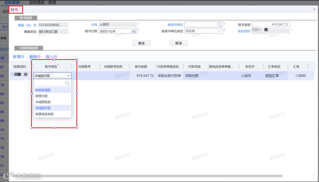 另一种背书退回方式是新增付款退款单,结算方式选择"应收票据背书",确认后也会自动生成应收票据结算单。