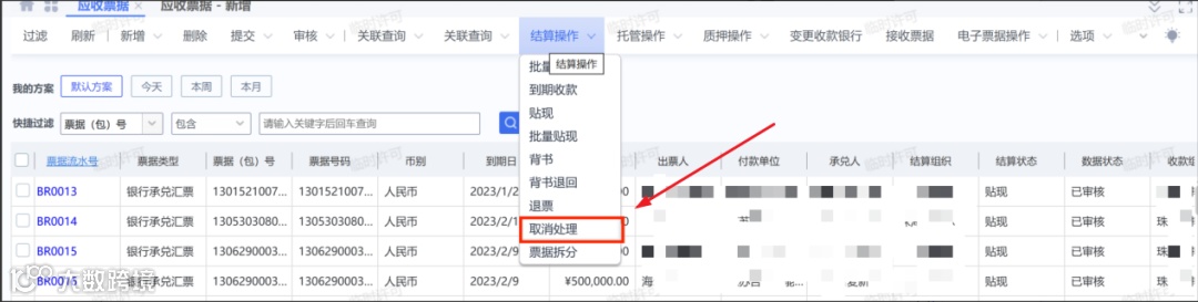 应收票据取消处理系统支持对已做背书、贴现、到期收款和退票的票据做取消处理,恢复之前的结算状态,并删除自动生成的单据。