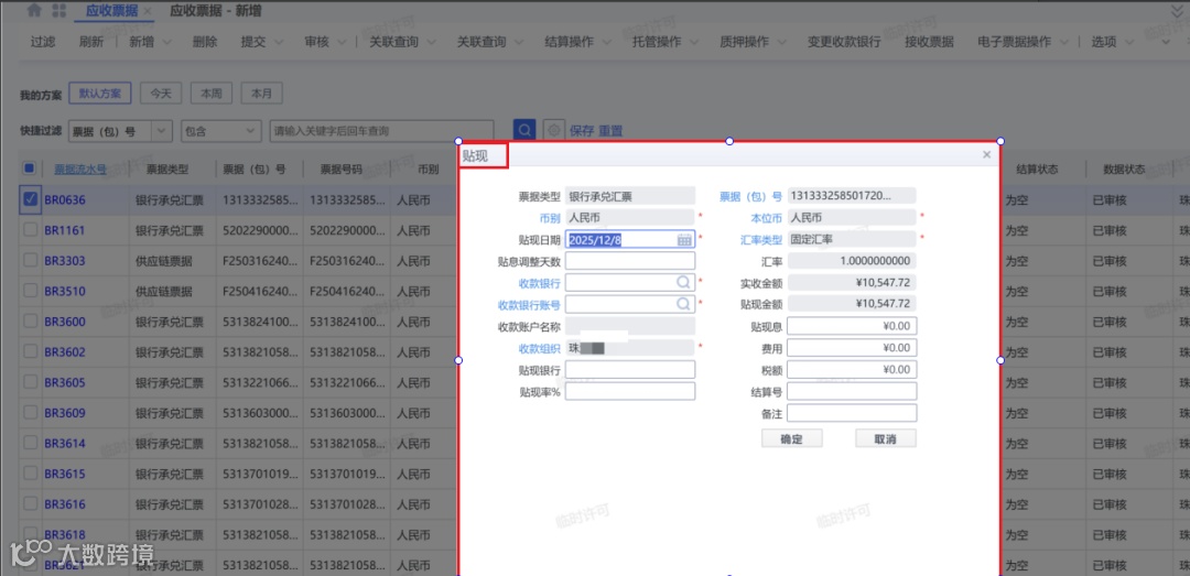该操作需要票据处于“已审核”且结算状态字段为“空”或者“背书退回”,点击结算操作——贴现或批量贴现,系统弹出对话框,录入贴现相关信息,应收票据结算状态变为“贴现”并自动生成应收票据结算单。