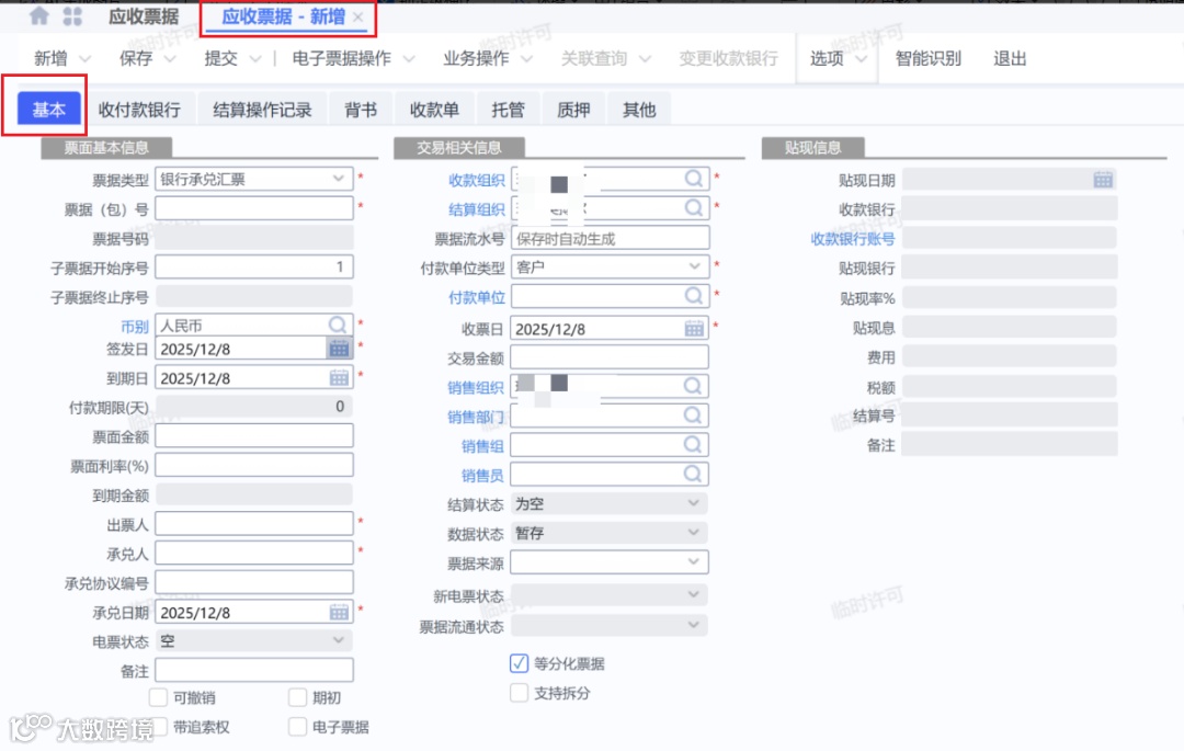 出票人是开出票据的公司,承兑人是指开票的银行,由于票据可以背书转让,因此出票人可能不等于客户,真正的客户信息在付款单位。保存、提交和审核默认自动生成收款单;