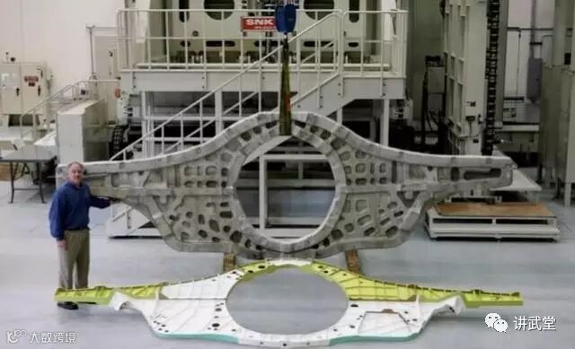 图:F35的铝合金大框锻造部件,与最终成品之间的对比