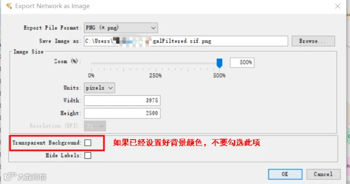 自今年8月份更新了Cytoscpe3.8.0及其以后的版本,新增了一个新功能--在导出网络图为图片时可以自主选择导出的图片是否为透明背景,如果你的网络图已经设置好了背景颜色,一定要将“Transparent Backgroud”取消勾选,不然好不容易设置好的背景就又变透明了~