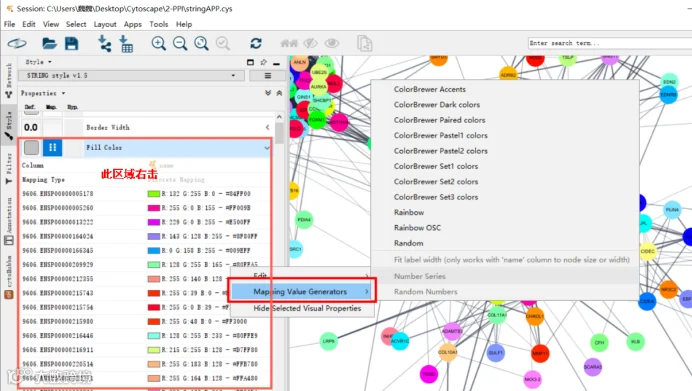 此时,在“Fill color”所在设置框中的任意位置右击鼠标,选择“Mapping Value Generators”,接着就界面上就会展示多个配色方式,供我们选择,可以切换配色方式实现对网络图整体的颜色风格修改。