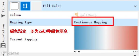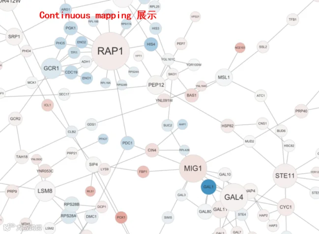 在Cytoscape中应用颜色较多的设置项就是节点颜色了,在节点颜色的设置上用得最多的有两种映射方式,一种是Continuous mapping,用于属性信息是数据的情况,还有一种是Disrete mapping,用于属性信息是分类数据的情况。