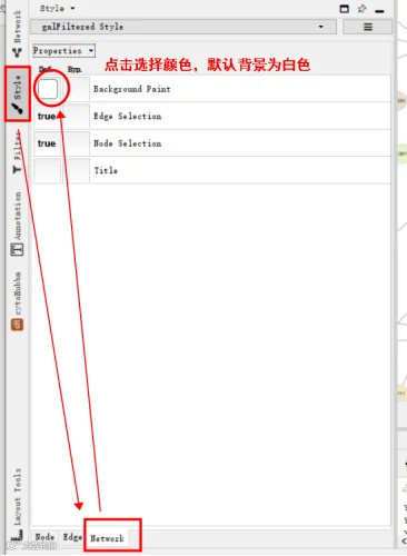 很多人以为这种加背景的操作是借助AI完成的,其实不是,在Cytoscape控制面板“Style”中,选择“network”既可以实现对整个网络背景的设置了。