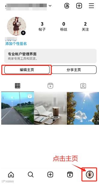在app页面右下角点击“头像”,进入主页,点击“编辑主页”