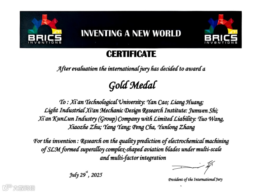 近期,西安工业大学联合西安院、昆仑集团共同完成的“融合多尺度因素的SLM成型高温合金复杂异形航空叶片的电解加工质量蚀除预测研究”,获得由发明者协会国际联合会(IFIA)颁发的金砖国家发明奖金奖(BRICS-Inventions)。