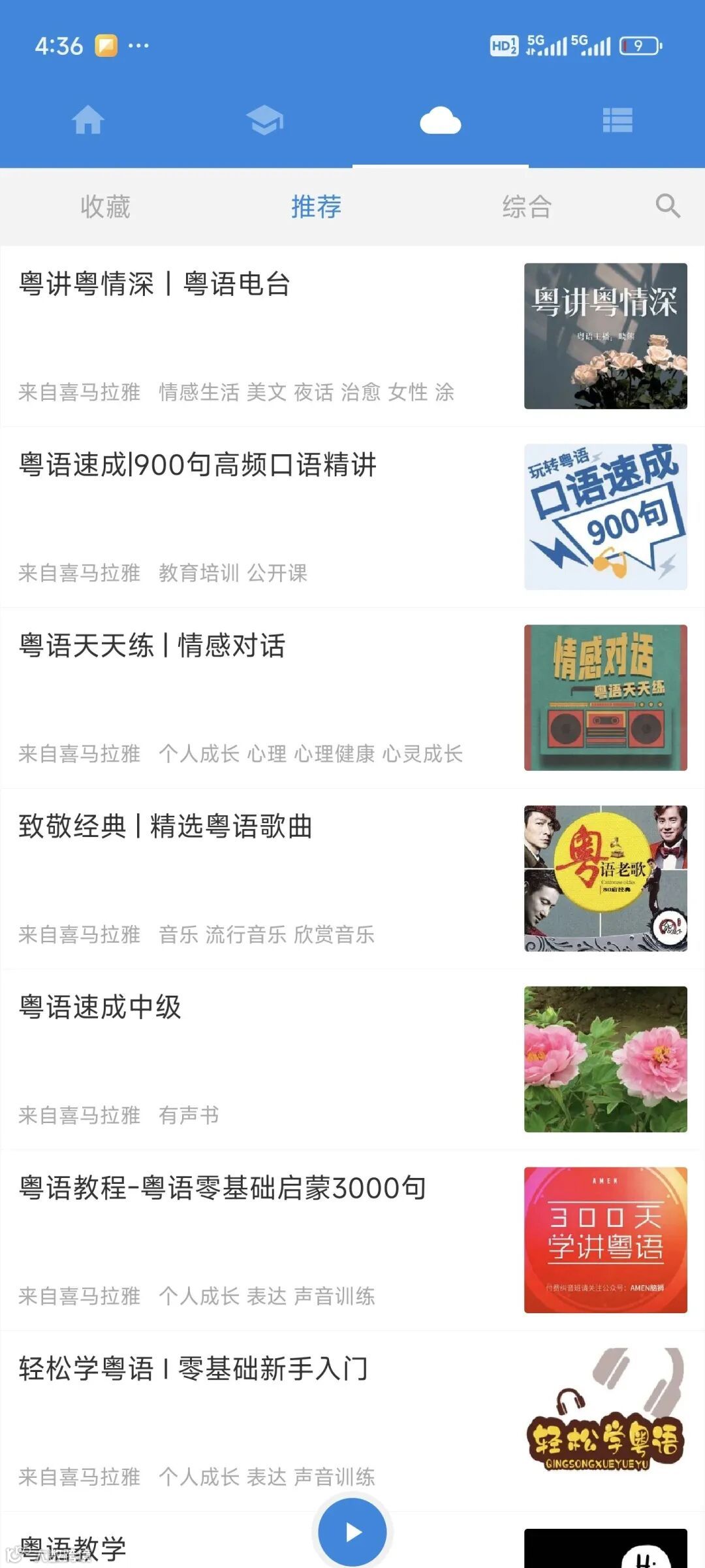 音频学习资源丰富,包括粤语电台、日常口语、句子示例、评书、教学和精讲等,听力与口语练习互相促进,资源更新也比较活跃。