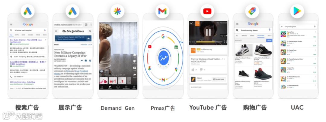 目前Google 后台投放的广告类型有搜索广告,展示广告,YouTube广告,购物广告,Pmax广告,去年新推出的Demand Gen广告,以及APP相关的UAC广告。