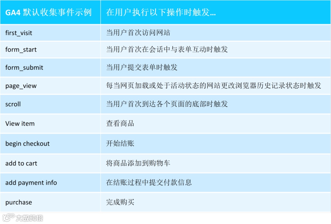 Event:事件,即用户在网站上进行的操作。安装GA4代码后,GA4将自动收集部分Event。