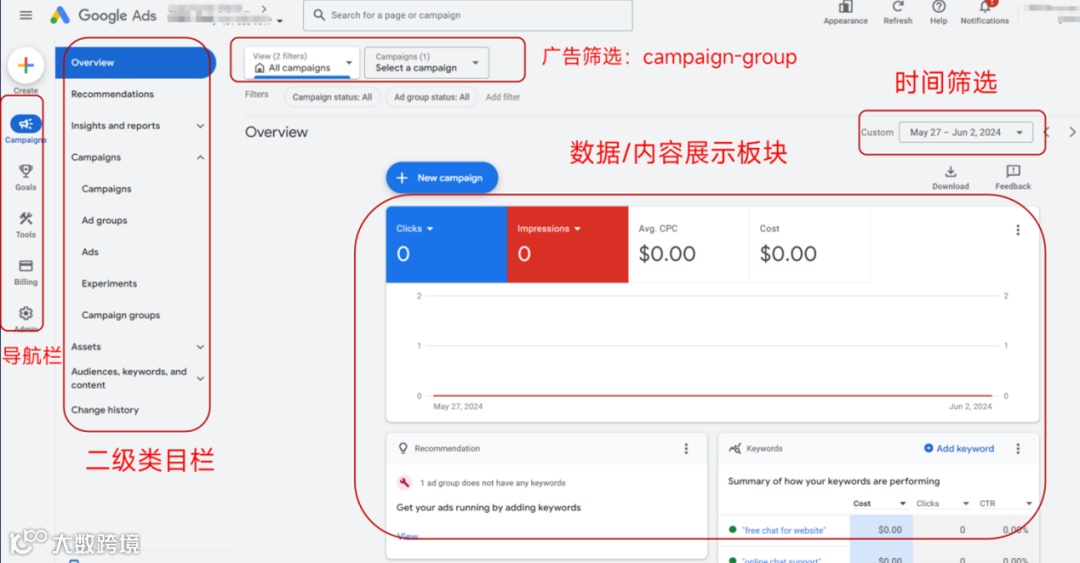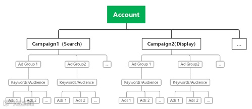 谷歌账户的基本框架为账户下可以为Campaign, Campaign细分不同Ad Group不同Ad Group内含不同Ads。
