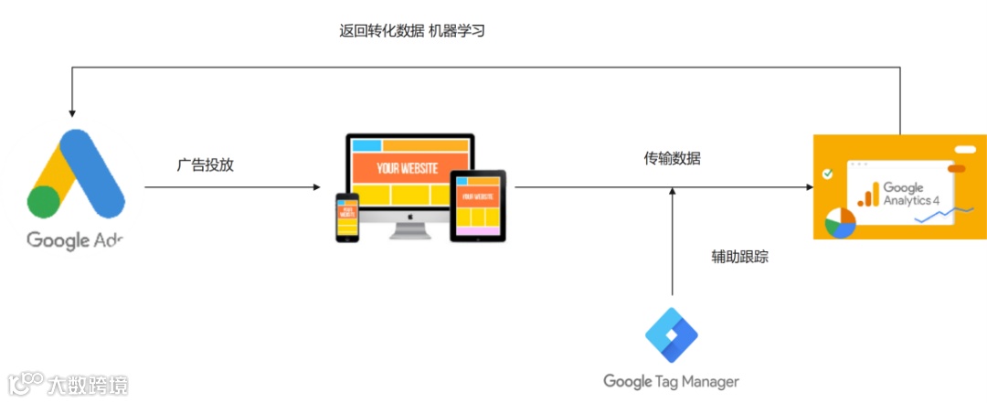 Google Ads对网站进行引流,网站传输数据至GA4,GTM辅助传输数据至GA4后台,由GA4再传输重要转化数据至google Ads平台进行机器学习。