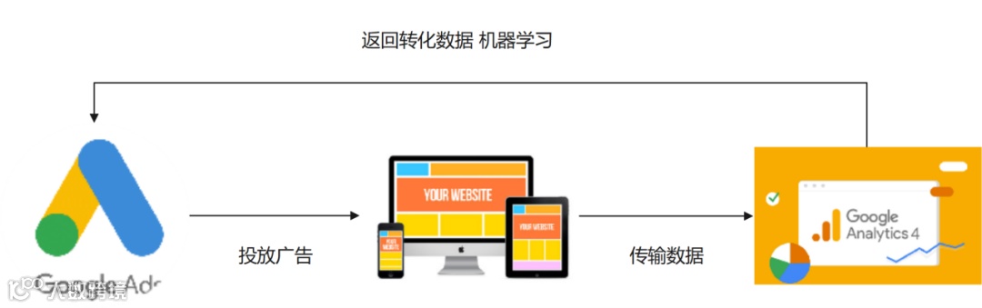 Google Ads对网站进行引流,网站传输数据至GA4,由GA4再传输Key Event数据至Google Ads后台衡量广告效果。