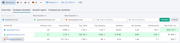 AWOL Vision, Greenworks和Exway都通过SEO优化和SEM付费广告来提升品牌在搜索引擎中的可见度。