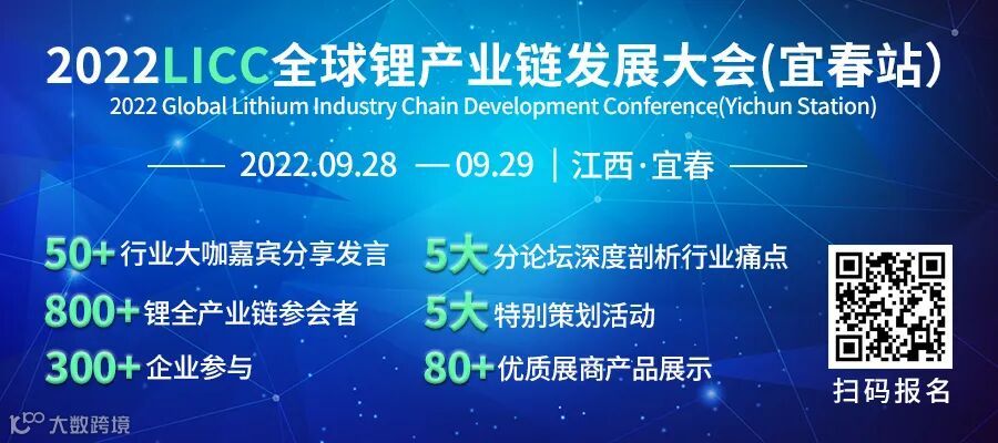 ⇩⇩⇩点击“阅读原文”报名“2022LICC全球锂产业链发展大会(宜春站)”