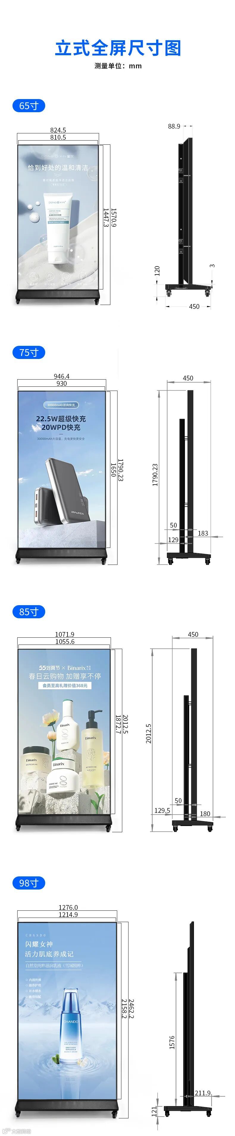 超窄边立式全屏广告机是主打窄边框设计的立式显示设备,核心特点是全屏无遮挡呈现画面。