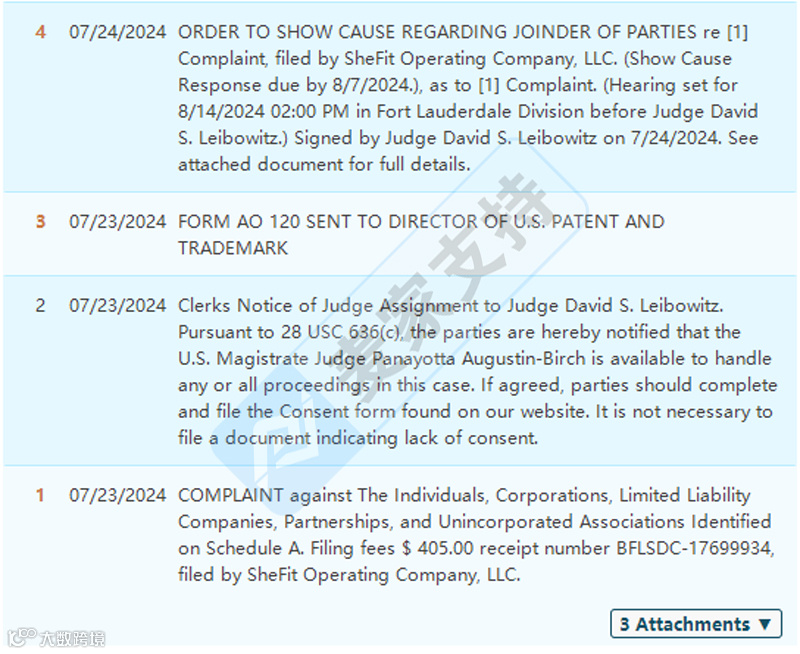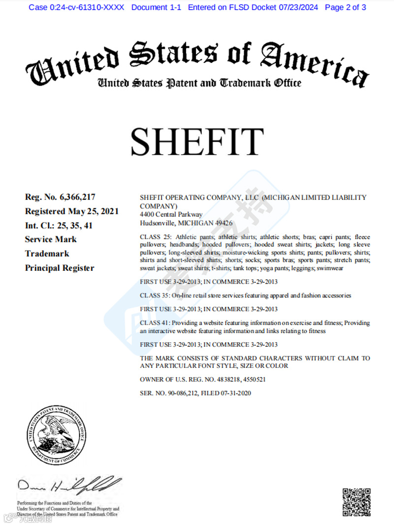 这是佛罗里达州的一起维权案件,BSF代理SheFit运动内衣的商标和专利维权。Shefit运动内衣早在21年5月便注册了商标,分别注册在第25, 35, 41大类。