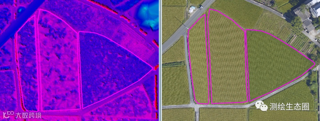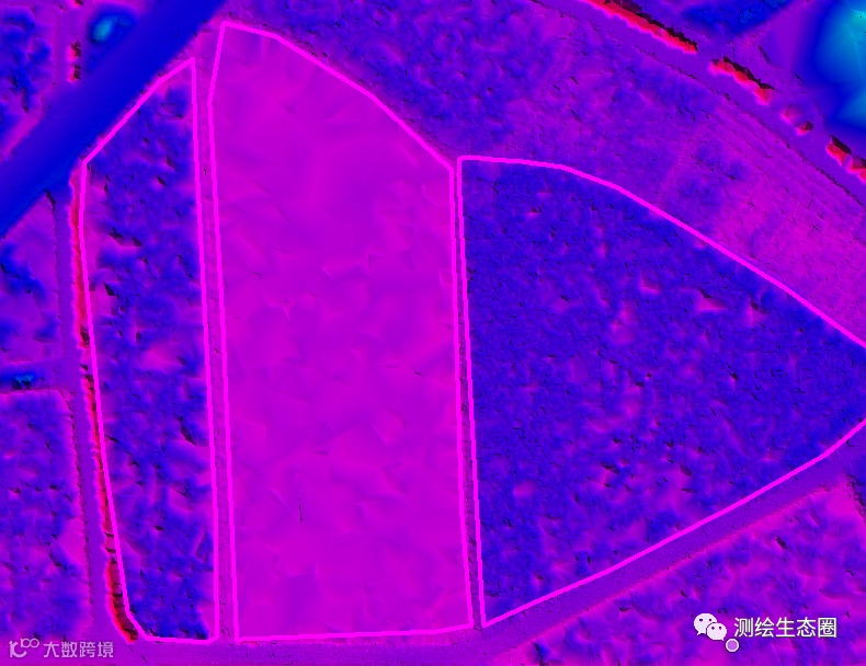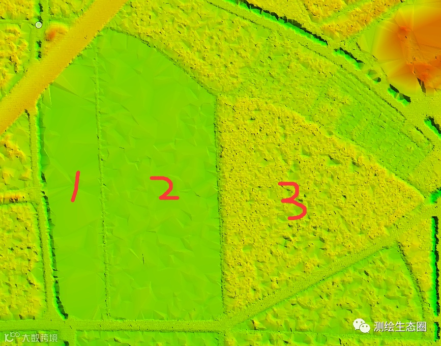 下图是利用按绝对海拔分类算法对1 2这两块地进行分类后的效果(纯自动分类,全程未添加任何人工分类),3未进行分类作为参考。