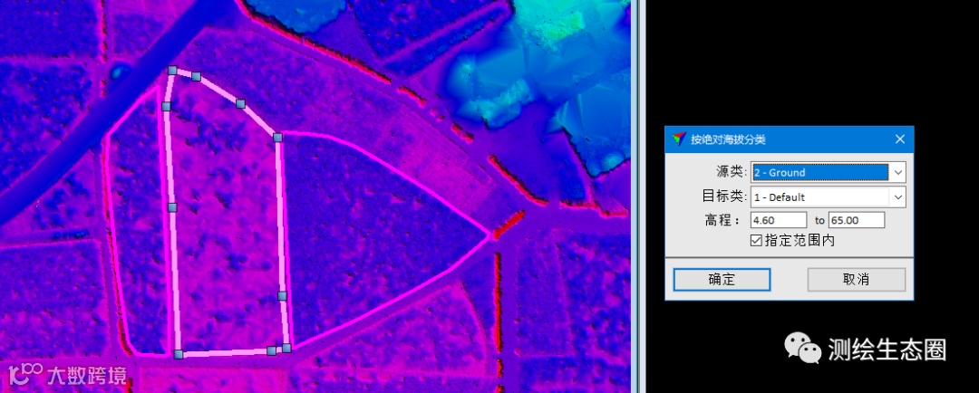 下图是利用按绝对海拔分类算法对中间这块地进行分类后的效果(纯自动分类,全程未添加任何人工分类)