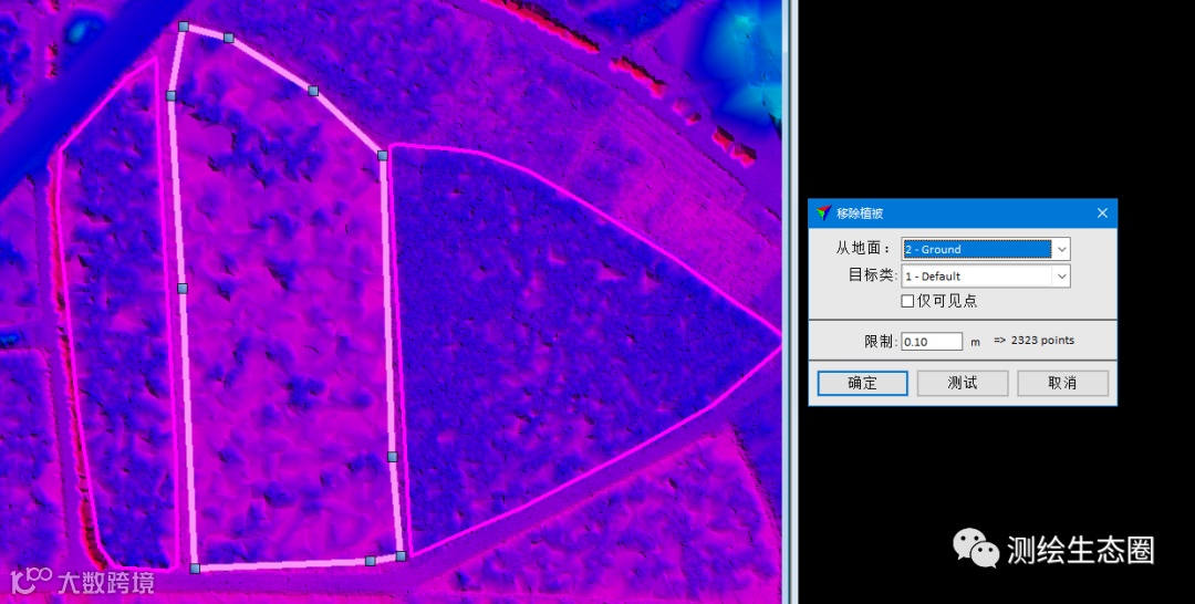 2、有的朋友可能会说那我用移除植被的分类算法运算下可以吧?其实针对有少量植被的地形用移除植被算法是没有问题的,但是这个地形就不太适用移除植被算法,因为它的大部分点云是采集在植被顶部,移除植被算法也会认为植被顶是地面点。这里大家使用移除植被算法测试下就清楚了,我们重点来讲具体这种地形用哪个算法更好一些。