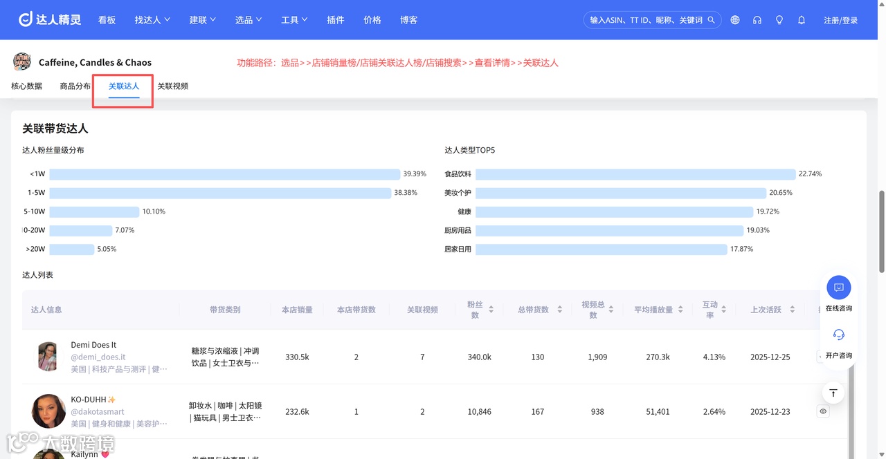 专业价值:此功能将低效的“大海捞针”变为高效的“精准制导”。这些达人已被验证对相关产品有浓厚兴趣和带货经验,大幅提升合作响应速度与最终转化率。