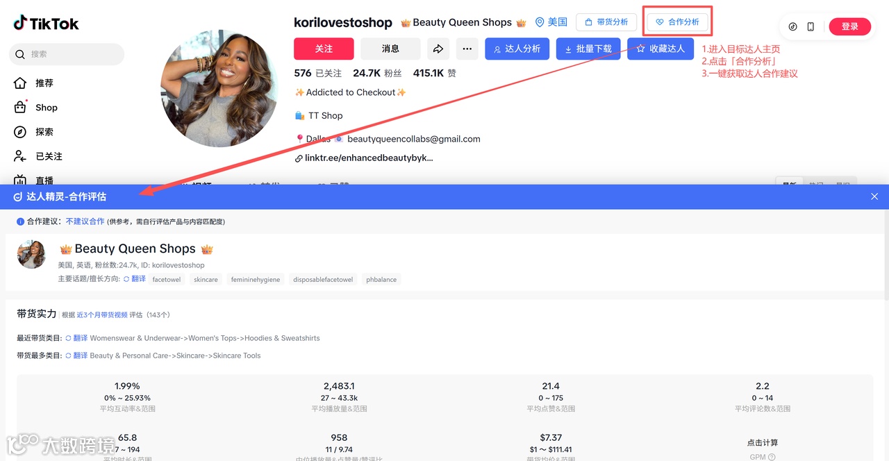 2.达人数据智能评估:在达人精灵插件端,你同样可以快速完成达人全景数据分析,进入目标达人主页后,借助“达人分析”、“带货分析”等功能,一键获取达人全景数据报告;点击“合作建议”,一键获取系统给出的智能合作建议,快速完成达人筛选。